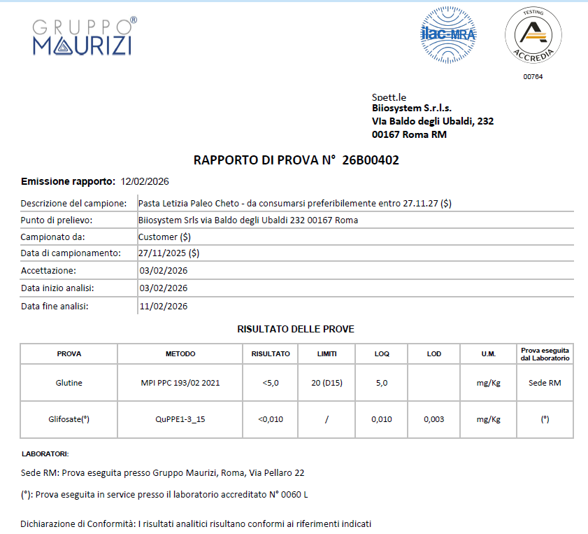Letizia è l’unica pasta al mondo Keto-Paleo che contiene meno di 0,010 mg/kg di glifosato.